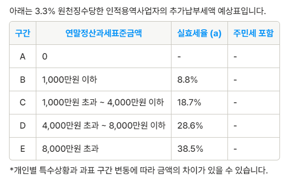 아래는 3.3% 원천징수당한 인적용역사업자의 추가납부세액 예상표입니다.